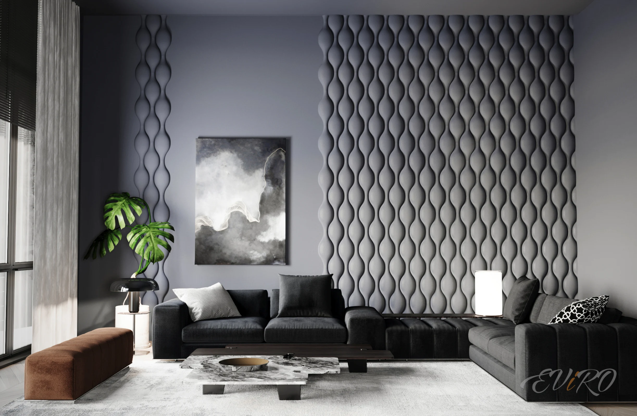 Взгляните на этот пример – элегантную демонстрацию 3D-панелей EViRO "Роберта" в интерьере гостиной. Здесь панели установлены секциями, словно живописные полотна, деликатно отделенные от основной стены, готовой принять любой оттенок.