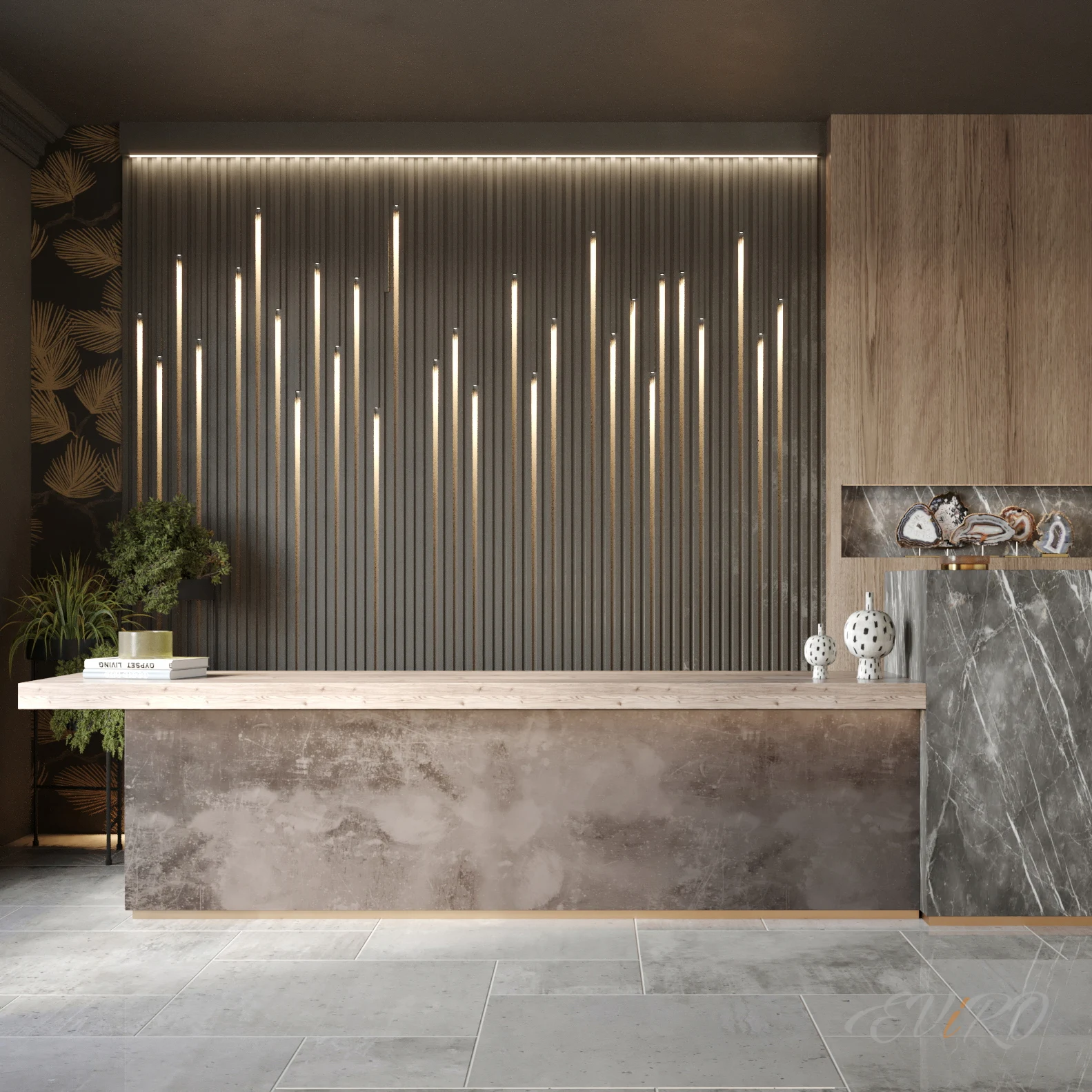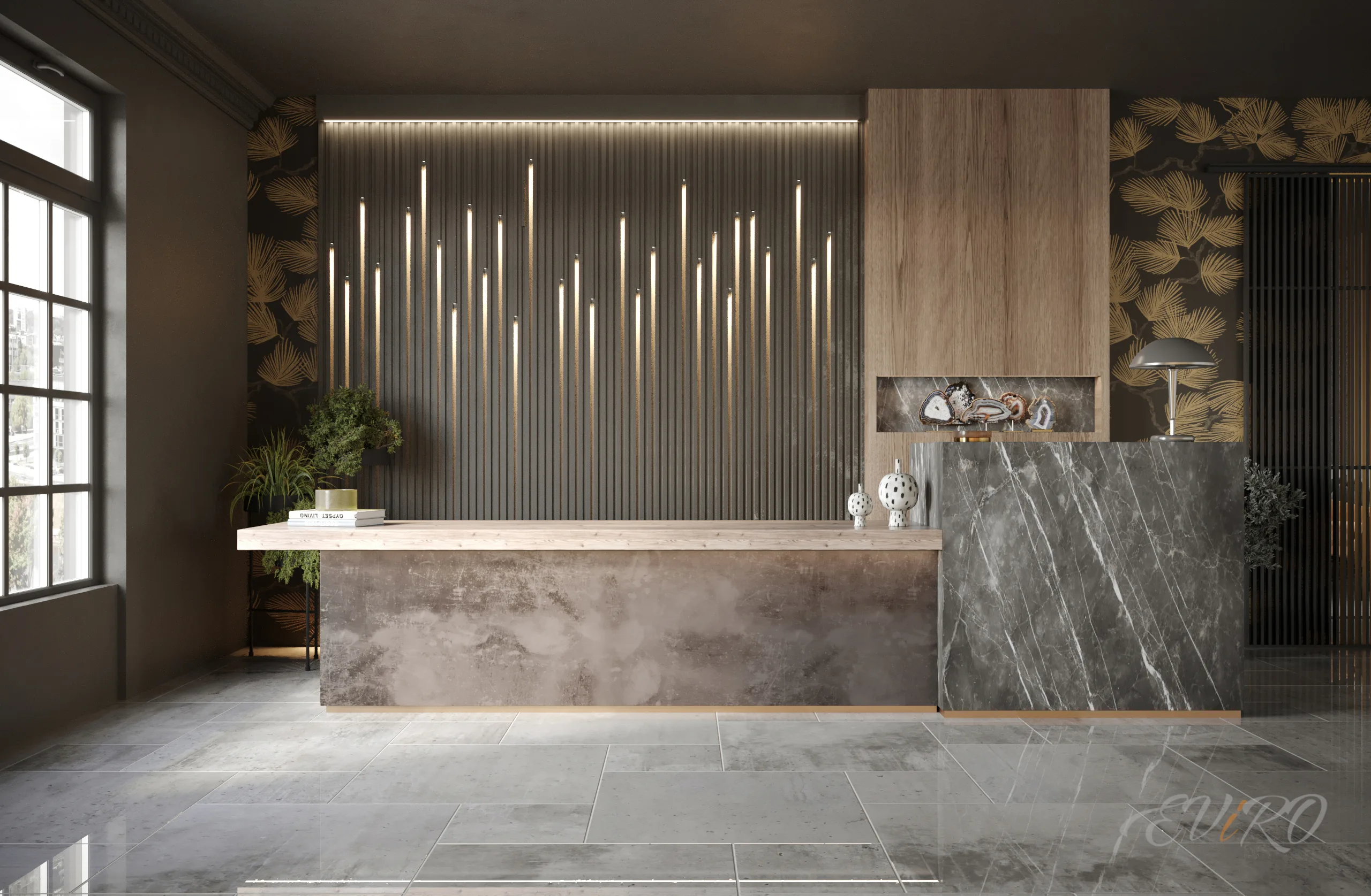 В зоне ресепшн, где первое впечатление играет решающую роль, декоративная рейка с интегрированной подсветкой предстает как квинтэссенция современного дизайна, сочетающего эстетику и функциональность. Вертикальные гипсовые рейки EViRO Max Band, словно стройные колонны, элегантно структурируют пространство, рождая ощущение гармонии и упорядоченности. Встроенные световые акценты, мягко окутывая стены, выгодно подчеркивают фактуру и геометрию реек, наделяя их глубиной и рельефностью.